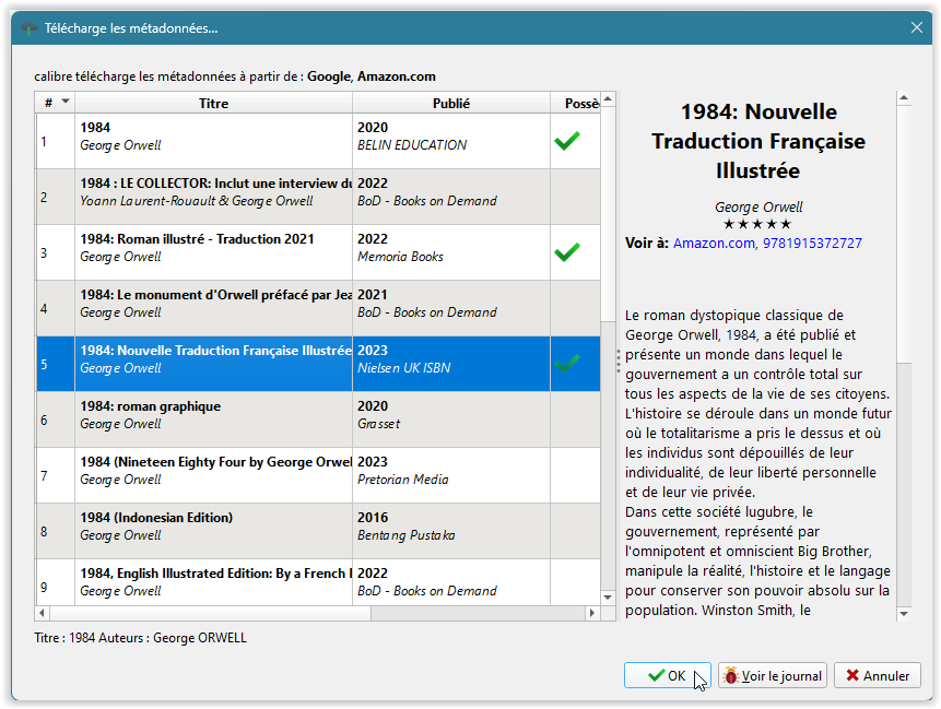 - Une fois le choix effectué, cliquer sur le bouton [OK] pour intégrer ces nouvelles informations dans les métadonnées de l'ouvrage. Si le résultat vous convient, cliquez sur le bouton [OK] pour entériner les modifications ; sinon, cliquez sur [Annuler] pour abandonner tout changement et revenir à la liste générale.