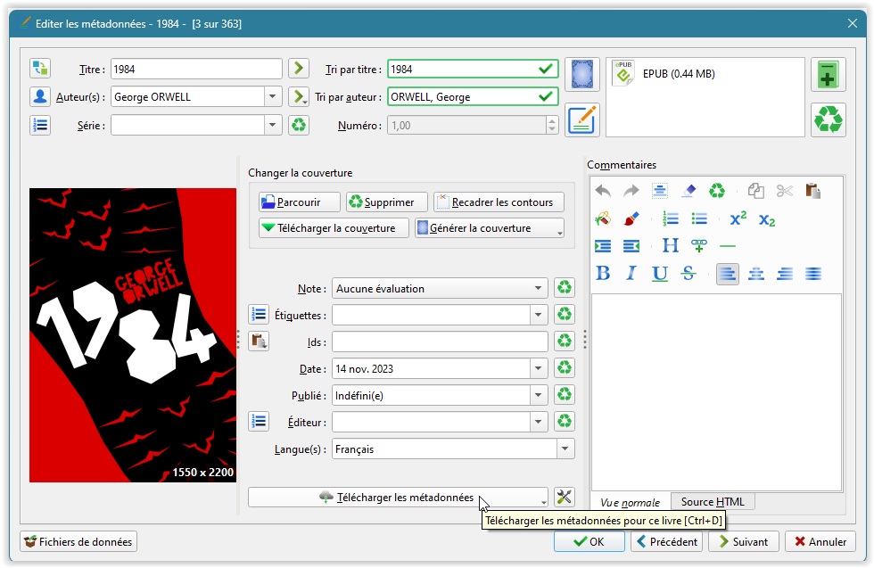 - Cliquer sur le bouton [Télécharger les métadonnées] situé assez bas dans cette fenêtre pour lancer la fonction de recherche de l'ouvrage chez les différents fournisseurs...
